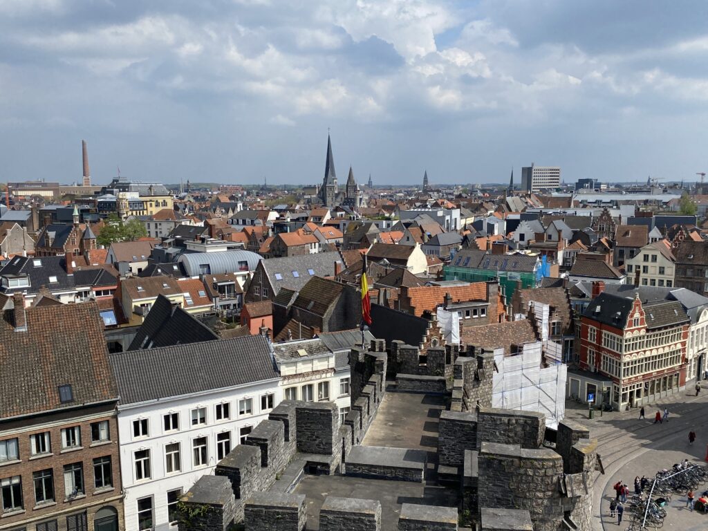 そして何より外せないのが、城の頂上からの眺望。階段を上った先には、オレンジ色の屋根が連なるゲントの街並みが広がります。尖塔がいくつも立ち並ぶ景色は本当に美しいです。