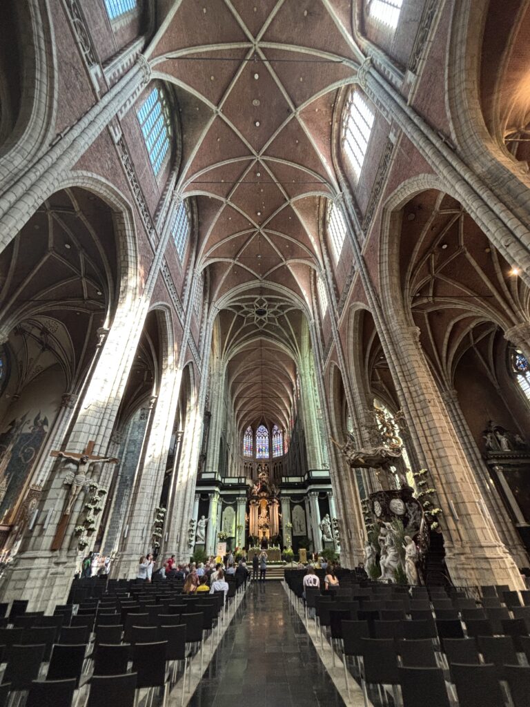 高い天井、ステンドグラスから差し込む光、静寂に包まれた空間。歴史と芸術が融合した、ゲントを代表するスポットです。